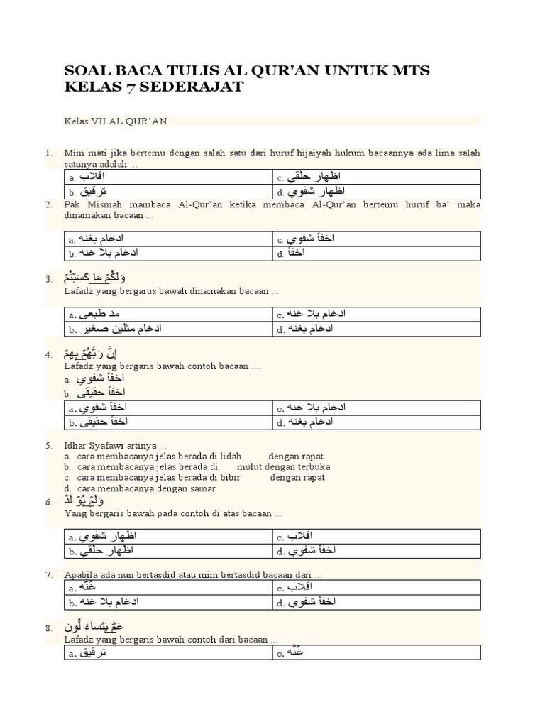 Kisi Kisi Btq S1 Kelas 1 Model Urut 2011 from imgv2-1-f.scribdassets.com Penilaian • teknik • soal/instrumen : Soal baca tulis al qur'an untuk mts kelas 7 sederajat; Kirimkan ini lewat emailblogthis!berbagi ke twitterberbagi ke facebookbagikan ke pinterest. Demikianlah pembahasan yang dapat kami sampaikan mengenai soal baca tulis alquran kelas 1 sd. Soal fiqih kelas viii (8) tahun 2017 singkat padat Smk n 1 maesan mata pelajaran : Soal fiqih kelas 7 mts teladan; Soal ujian satuan pendidikan berbasis komputer pen.